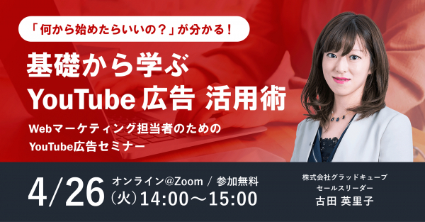 株式会社グラッドキューブ(本社:大阪市中央区 代表取締役 CEO 金島弘樹 以下:グラッドキューブ)は、4月26日(火)14:00〜基礎から学ぶ YouTube 広告活用術をテーマにオンラインセミナーを開催いたします。