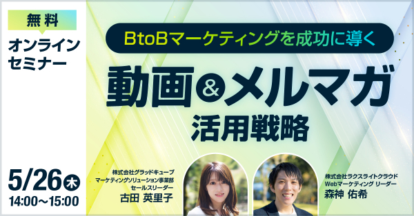 株式会社グラッドキューブ(本社:大阪市中央区 代表取締役 CEO 金島弘樹 以下:グラッドキューブ)は、5月26日(木)14:00〜BtoBマーケティングを成功に導く「動画&メルマガ」活用戦略をテーマにオンラインセミナーを開催いたします。