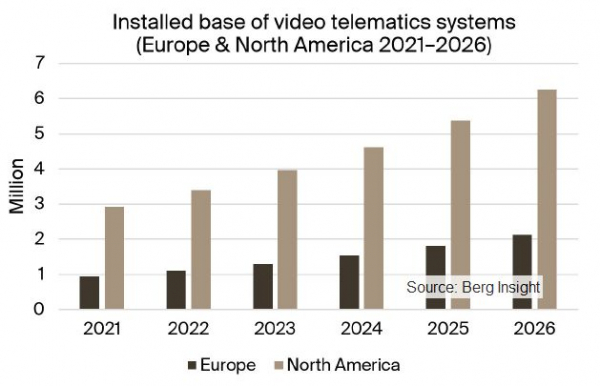 Berg Insightは、欧州と北米のビデオテレマティクスシステムの有効インストールベースは2021年末までに約390万台、2026年までには870万台に達し、CAGR16.8%で成長すると予測しています。