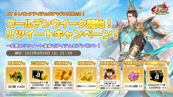 Playbest Incは、現在好評配信中のスマートデバイス向けゲーム「三国志名将伝」において、実施中・実施予定のゴールデンウイーク(GW)記念イベントについて、それぞれの詳細・続報を公開いたします。これらのイベント、及びキャンペーンにご参加いただくことで、新たな秘伝LR武将「英主・劉備」「仁君・劉備」いずれかをどなたでも獲得することが可能です。