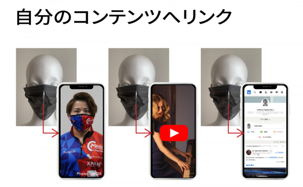 XPANDコードに対応したスマホアプリでマスクを読み取ることで、任意のスマホコンテンツにジャンプします。