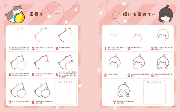 本書はぽっちゃりとした猫たちをペン1本で簡単に描けるようになる癒し系イラスト練習帳です。