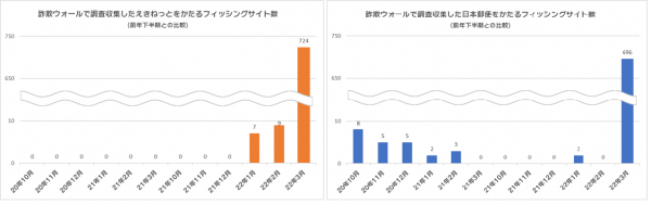 上記グラフは前年同時期との比較を表しており、えきねっとおよび日本郵便をかたったフィッシング詐欺サイトは前年同時期においては確認されず、2022年に入ってから数件発生した程度でしたが、えきねっとをかたるフィッシング詐欺サイトは2022年3月度に724件、日本郵便をかたるフィッシング詐欺サイトは696件とそれぞれ急激に増加したことから、過去とは異なる特徴的な傾向と見受けられます。