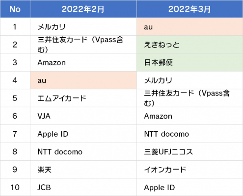 なお、詐欺ウォールで収集したフィッシング詐欺サイトで盗用されていたブランドの上位10位は以下の結果です。先月4位だったauが1,116件と844件増加し1位となりました。また、先月1位であったメルカリは4位にランクダウンしています。