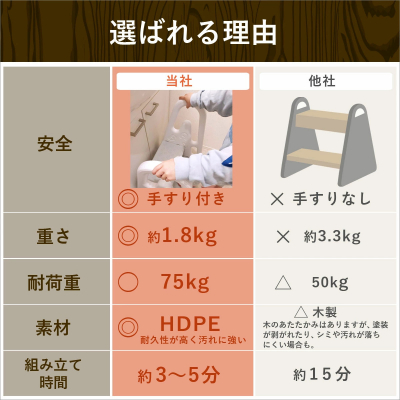 つかみやすい手すり付きで軽量なので、お子様がご自分で洗面台やキッチンに運んで手洗いやお手伝いができます。万が一ぶつけてしまっても、木製のステップ台に比べて衝撃が少なくケガのリスクを低減します。