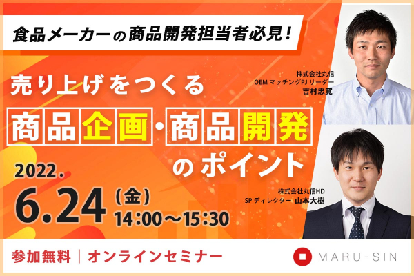 株式会社丸信は、6月24日(金)に、食品の商品企画や商品開発のポイントを開設する無料Webセミナー「売り上げをつくる商品企画・商品開発のポイント」を開催いたします。5月26日に参加お申込み受付を開始しました。当社が運営する食品通販サイト「九州お取り寄せ本舗」と食品開発ポータルサイト「食品開発OEM.jp」の責任者が講師として登壇し、具体的な事例を交えながら商品企画や商品開発の重要性や考え方について紹介いたします。