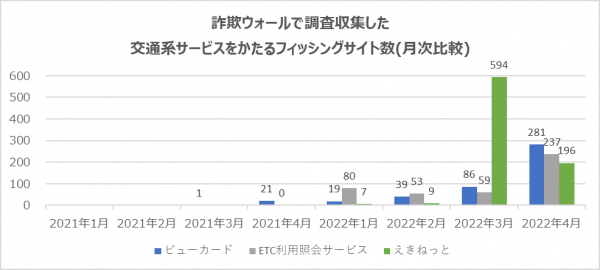 2022年4月度のインターネット詐欺リポートでは、ETC利用照会サービス、ビューカード、えきねっと、といった交通系サービスをかたるフィッシング詐欺の増加について取り上げます。