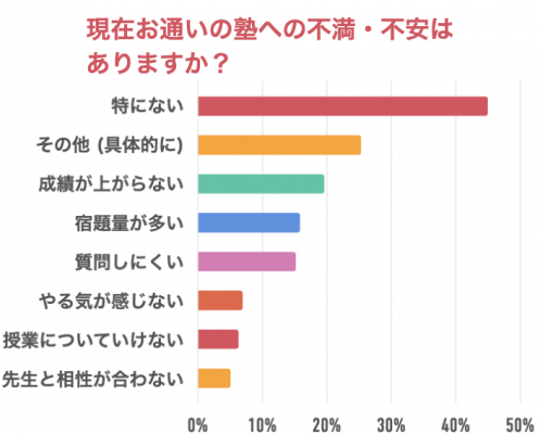 「特にない」が45%、「その他(具体的に)」が25%、「成績が上がらない」が20%、「宿題量が多い」が16%、「質問しにくい」が15%、「やる気が感じない」が7%、「授業についていけない」が6%、「先生と相性が合わない」が5%、という回答でした。