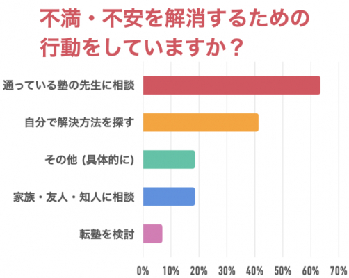 「通っている塾の先生に相談」が63%、「自分で解決方法を探す」が41%、「その他(具体的に)」が19%、「家族・友人・知人に相談」が19%、「転塾を検討」が7%という回答でした。