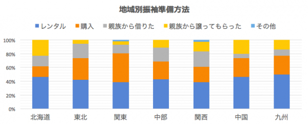 さらに、地域別に振袖の準備方法を比較した結果をグラフ化しました。基本的にはどの地域も「レンタル」が最も多く、次に「購入」が続きますが、関東では「購入」が「レンタル」を上回りました。また、北海道と関西では、「購入」と「親族から借りた」が並びました。