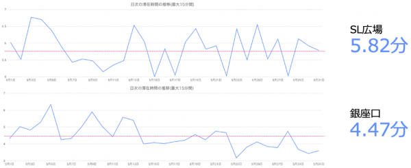 また、滞在時間を比較すると、銀座口が期間中の平均4.47分なのに対して、SL広場では5.82分で1分以上SL広場が長いことが分かります。銀座口は主に横断歩道の信号待ちですが、SL広場は待ち合わせのために滞留している人々が相対的に多く、このような結果になっていることが推察されます。