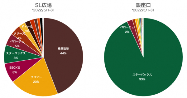 両拠点のカフェの利用状況を見てみると大きな違いがあることが分かります。SL広場では近隣にある椿屋珈琲やプロントが多く、他のカフェも散見されますが、銀座口では9割超をスターバックスが占めています。銀座口には汐留も含めるとスターバックスが6店舗あり集中していることもありますが、そもそも目的や消費傾向が違うことを伺い知ることができます。
