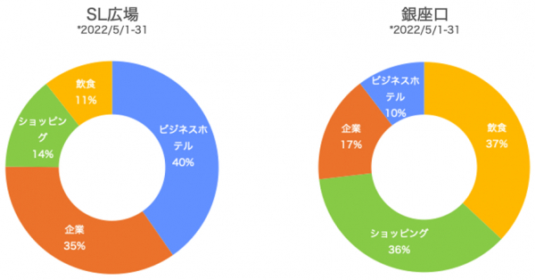 次に新橋駅銀座口とSL広場の人々は何をするために新橋を訪問したのでしょうか?興味深いことに新橋駅を挟んで全く異なる結果となりました。期間中SL広場ではビジネスホテルや企業、つまり仕事目的の人々が多かったのに対して、銀座口では飲食やショッピング目的の人々が多く、割合もほぼ正反対となっています。同じ駅とは言え、出口やエリアごとに人々の行動や目的が異なることが伺えます。