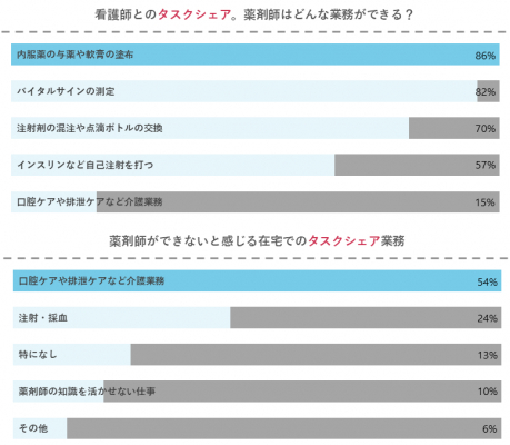 アンケートの結果、タスクシェアに賛成の薬剤師は76%で「薬剤師の職能・職域が広がるから」という意見が最も多い一方、薬剤師ができないと感じる在宅でのタスクシェア業務は「口腔ケアや排泄ケアなどの介護業務」が54%。タスクシェアには前向きだが、介護業務に抵抗を感じる薬剤師が多い結果となりました。