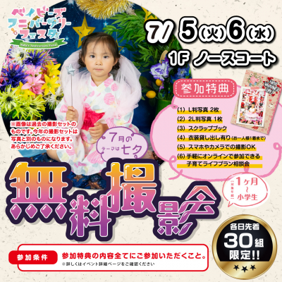 デザイナーが季節に合わせてデザインした背景でプロカメラマンが撮影するベビー&キッズの無料撮影イベントです。「七夕」の背景で無料で撮影、L判写真2枚と2L判写真1枚をプレゼント。季節に合わせたスクラップブックも差し上げます。さらに気軽にオンラインで参加できる、お子様の未来を考える「子育てライフプラン相談会」を開催いたします。(後日開催)