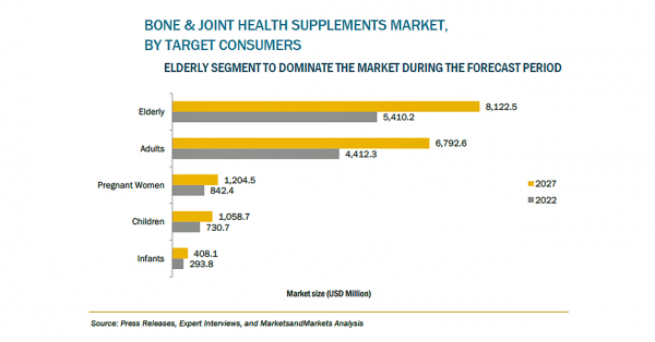 骨・関節用健康サプリメントの市場規模は、2022年の117億米ドルからCAGR8.5%で成長し、2027年には176億米ドルに達すると予測されています。ビタミンDやカルシウムなどの栄養補助食品に対する需要の高まりにより、市場の拡大が期待されています。栄養補助食品分野における技術革新が、骨と関節用健康サプリメントの需要を後押しし、製品の多機能性につながっています。また、技術進歩も、多くの産業における用途を広げるのに役立っています。