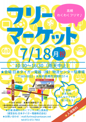 日本タイガー電器株式会社(本社:大阪府高槻市、代表:津田眞秀)は、同社運営のフリーマーケットイベント「高槻わくわくフリマ♪」(https://fleamkt.santasan.net/)を同社物流センター駐車場(高槻市須賀町)にて2022年7月18日(祝日)に開催します。