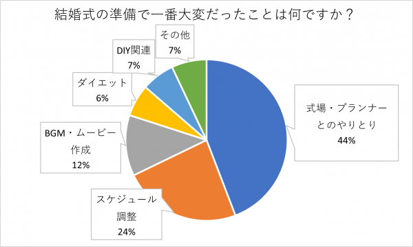 「式場・プランナーとのやりとり」が44.2%、「スケジュール調整」が23.6%、「BGM・ムービー作成」が12.2%、「DIY関連」が6.6%、「ダイエット」が6.4%、「その他」が7%でした。結婚式はこまごまとした決定事項や準備の連続。しかし「結婚式準備に妥協したくない」「時間がかかっても満足度の高い結婚式を挙げたい」と思う花嫁が多いようです。