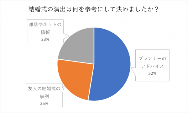 「プランナーのアドバイス」が最も多く52.6%、続いて「友人の結婚式の事例」が24.6%、「雑誌やネットの情報」が22.8%という結果になりました。