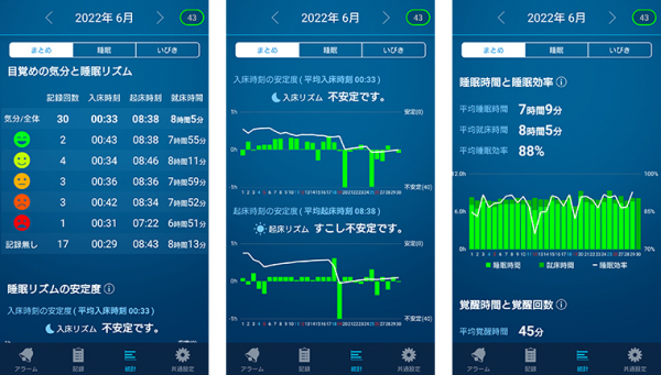 統計の(まとめ)画面は、月ごとの統計データを表示します。各種数値の前月比較、睡眠リズム、睡眠時間、いびき等の傾向を数値とグラフで確認することができます。睡眠改善のためのアクションにより、睡眠がどのように変化したかが一目で確認できます。