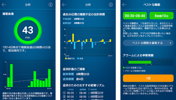 ◆睡眠負債を可視化と改善のためのアドバイスをする「分析画面」【新機能】