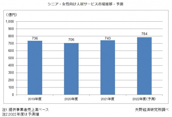 【矢野経済研究所プレスリリース】シニア・女性向け人材サービス市場に関する調査を実施(2022年)2021年度のシニア・女性向け人材サービス市場は前年度比5.2%増の743億円