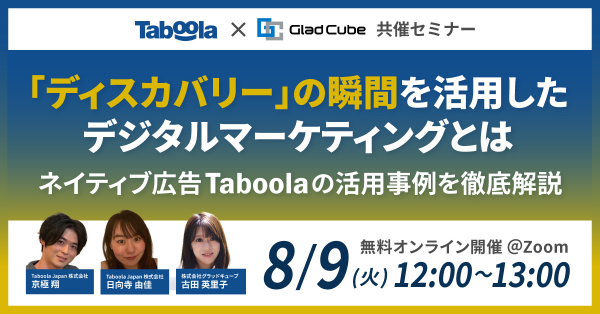 株式会社グラッドキューブ(本社:大阪市中央区 代表取締役 CEO 金島 弘樹 以下:グラッドキューブ)は Taboola Japan 株式会社(本社:東京都港区、代表:石井 眞)と共催で、8月9日(火) 12:00〜 「ディスカバリー」の瞬間を活用したデジタルマーケティングをテーマにオンラインセミナーを開催いたします。