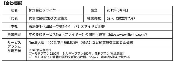 株式会社フライヤーは、本の要約サービス「flier(フライヤー)」を運営する、ITベンチャー(2013年6月設立)です。最大の特長は「書評(レビュー)」ではなく「要約」である点です。書き手の主観が入る書評とは異なり、著者の主張や論理(重要ポイントや全体像)を忠実にまとめ、読者に伝えます。書評でないため、出版社と著者から要約の許可を得る必要があり、要約した原稿にも目を通していただくことで、高品質なサービスを提供しています。
