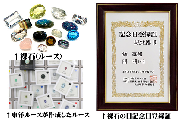裸石(はだかいし)の日とは、8(は)月14(いし)日に東洋ルースが発案した記念日でルースブームやルース業界全体を盛り上げるために作られた記念日として2022年に日本記念日協会にて制定された記念日になります。