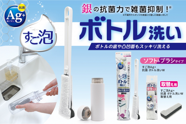 東和産業株式会社(本社:和歌山県海南市、代表取締役:吉田昌弘)は、安全性の高い銀系抗菌加工を施したスポンジを使ったボトルの底や凸凹面がスッキリ洗えるボトル洗い用柄付クリーナー「すご泡Ag+抗菌 ボトル洗いW・取替用」を2022年7月1日に発売しました。
