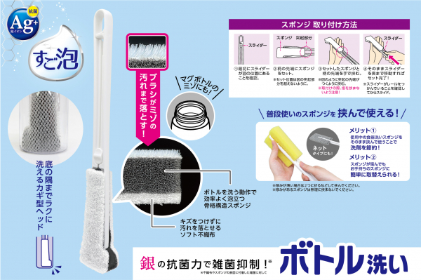 スポンジの表面に付着した雑菌に対して安全性の高い銀系抗菌加工を施したスポンジを使用したボトル洗い用柄付クリーナーを開発しました。