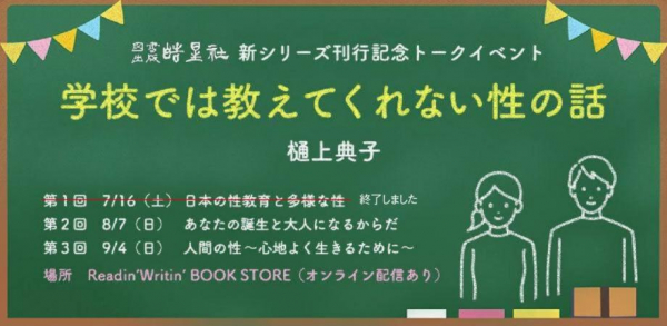 株式会社皓星社(本社:東京都千代田区、代表取締役社長:晴山生菜)は、若年層向け【学校では教えてくれない】シリーズの刊行記念として、性教育の実践に携わってきた樋上典子さんをお迎えし、トークイベント全3回(2022/7/16、8/7、9/4)を開催します。