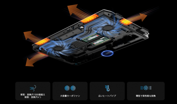 ヒートパイプを厚くして、薄いブレードの大容量ターボファンに加えてCPUとGPUの熱を効率よく排出します。背面には換気口が1300個を超え、側面には4つの換気口が設けられ、広い放熱エリアが確保でき、通気性が高い内部設計で高放熱効率と低音を両立しています。マシン内部の温度を下げ、常に安定で高い性能を引き出します。通気性が確保することにより、マシン内部の温度を下げ、常に安定で高い性能を引き出します。