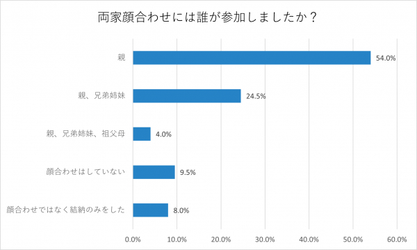 「親」が54%、「親、兄弟姉妹」が24.5%、「親、兄弟姉妹、祖父母」が4%、「顔合わせはしていない」が9.5%、「顔合わせではなく結納のみをした」が8%という結果に。新郎新婦とそれぞれの両親で顔合わせをおこなった方が半数を占めていますが、兄弟姉妹や祖父母も参加したという回答もありました。