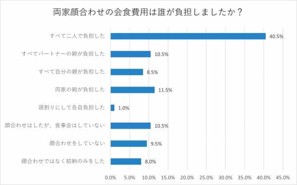 最も多かったのが「すべて二人で負担した」で40.5%、「すべてパートナーの親が負担した」は10.5%、「すべて自分の親が負担した」は8.5%、「両家の親が負担した」は11.5%、「頭割りにして各自負担した」は1%、「顔合わせはしたが、食事会はしていない」は10.5%、「顔合わせをしていない」は9.5%、「顔合わせではなく結納のみをした」は8%でした。