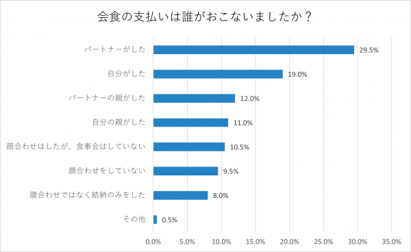「パートナーがした」が29.5%、「パートナーの親がした」が12%、「自分がした」が19%、「自分の親がした」が11%、「その他」が1%、「顔合わせはしたが、食事会はしていない」が10.5%、「顔合わせをしていない」が9.5%、「顔合わせではなく結納のみをした」が8%ということがわかりました。