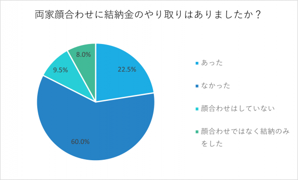 両家顔合わせの際に結納金があったかどうか尋ねたところ、「あった」と回答した人が22.5%、「なかった」が60%、「顔合わせはしていない」が9.5%、「顔合わせではなく結納のみをした」が8%でした。