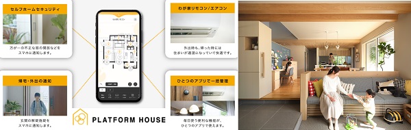 PLATFORM HOUSE touchは、間取り図と鍵・エアコン・照明などの機器を連携させた、業界初の視覚的に直感操作できるスマートフォンアプリです。アプリ1つで、子どもや家族の帰宅・外出の通知や、家の今の状態を確認し操作ができるなど、いつでもどこからでも「住まい」と「家族」を見守り安心を提供します。
