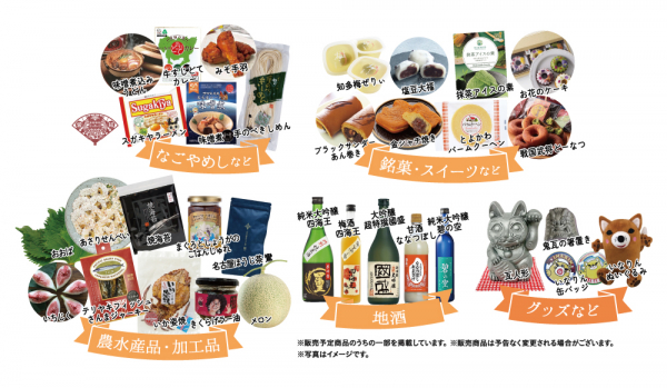 ■出展事業者(自治体) ■主な販売商品相生ユニビオ株式会社(西尾市) 碧の空 純米大吟醸、碧州 ウイスキー 等愛知県農産物需要拡大推進協議会 いちじく、おおば、夏秋なす株式会社青山(西尾市) いか姿焼、たこ姿焼、特選いか照焼 等株式会社秋田製麺所(豊山町) 奴の角久八丁味噌煮込みうどん、骨げんきしめん 等有限会社岩月鬼瓦(高浜市) お香立て、鬼瓦箸置き、鬼瓦の根付 等株式会社お亀堂(豊橋市) ブラックサンダーあん巻き、つぶあん巻 等株式会社オリエンタル(稲沢市) あいちの牛すじどてカレー、台湾カレーミンチ ☆和菓子処 春日井よし乃(名古屋市) 塩豆大福、鬼まんじゅう、本わらび餅 等株式会社木耳のお店(豊川市) きくらげラー油、きくらげしそ高菜 等株式会社宏昌食糧研究所(西尾市) 西尾の抹茶 抹茶アイスの素 等 ☆株式会社サガミフード(名古屋市) 宇宙日本食 サガミ純鶏名古屋コーチン味噌煮 等 ☆寿がきや食品株式会社(豊明市) SUGAKIYAラーメン、台湾ラーメン ☆株式会社千両(名古屋市) みそたま、みそ手羽、金シャチ焼き 等 ☆立石海苔店(名古屋市) 愛知県産焼海苔 白袋きず、渥美産あおさのり 等有限会社寺本饅頭本舗(知多市) 梅ぜりぃ、ちょうどいいまち知多 梅干ようかん 等とよあけ花マルシェプロジェクト 豊明銘菓『桶狭間太鼓』、お花のケーキ 等豊川市観光協会 香月堂バウムクーヘン、いなりん茶 等中埜酒造株式会社 (半田市) 超特撰國盛 大吟醸、國盛 ななつぼしあまざけ 等株式会社平松食品(豊川市) テリヤキフィッシュさんまジャーキー 等福井酒造株式会社(豊橋市) 四海王 純米大吟醸 夢幻 等有限会社マリーヌ洋菓子店(豊明市) 戦国武将どーなつ 等株式会社妙香園(名古屋市) 名古屋ほうじ茶 鸞、どあら茶 セット 等 ☆道の駅田原めっくんはうす(田原市) 渥美半島産メロン、焼きキズ海苔 等 ☆・・・アルファポイントによる委託販売
