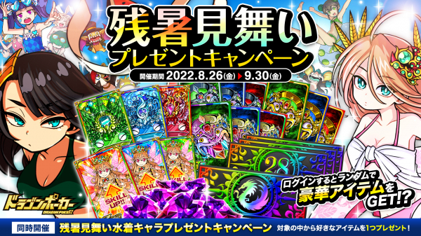 期間中、ログインすると、竜石や「SSレアガチャチケット」「女神スキルフェアリー」「天輝ジェムマローン」など、豪華アイテムが毎日ランダムでもらえる「残暑見舞いプレゼントキャンペーン」を開催いたします。さらに、対象の中から好きなアイテムを1つもらえる「残暑見舞い水着キャラプレゼントキャンペーン」も同時開催!『ドラゴンポーカー』に毎日ログインして、豪華報酬を受け取りましょう!