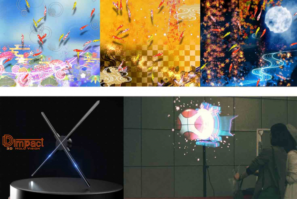 今回の展示では、3次元の仮想空間を創造する3Dホログラムディスプレイ 「Dimpact(R) 3D Holo Vision」を活用した空間演出を体験できます。