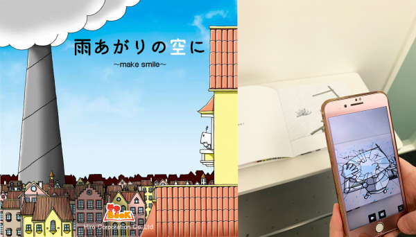絵本「雨あがりの空に〜make smile〜」は、ARアプリ「COCOAR(ココアル)」※のサービスを使用し、お手持ちのスマートフォンやタブレットで絵本の指定ページをスキャンすることにより、絵本とリンクした臨場感あふれるリアルな映像が目の前に飛び出し、視覚(目)だけではなく、聴覚(耳)でも楽しむことができる絵本となっております。