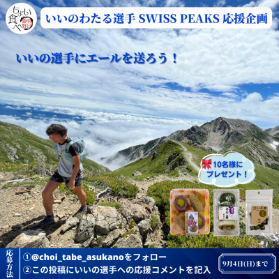 アスリートを応援する明日香野のサブアカウント、ちょい食べ明日香野をフォローして、「いいの選手Swiss Peaks応援」キャンペーンの投稿にいいの選手に対する応援のコメントをするだけで参加可能です。