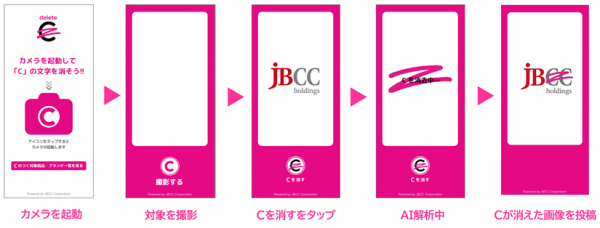 JBCCホールディングスは、この活動に多くの人がより気軽に参加できるよう「C」を消すオリジナルWEBアプリを参加者に無償で提供します。このアプリはスマートフォンおよびタブレット、モバイルPCなどのカメラと連動し、アプリを使って撮影した画像内に含まれるJBCCホールディングスの社名ロゴや、協賛企業の対象商品・対象ブランドの「C」の文字をAIが認識し、その「C」の文字を自動で消します。そして「C」が消された画像をSNSに簡単に投稿できます。