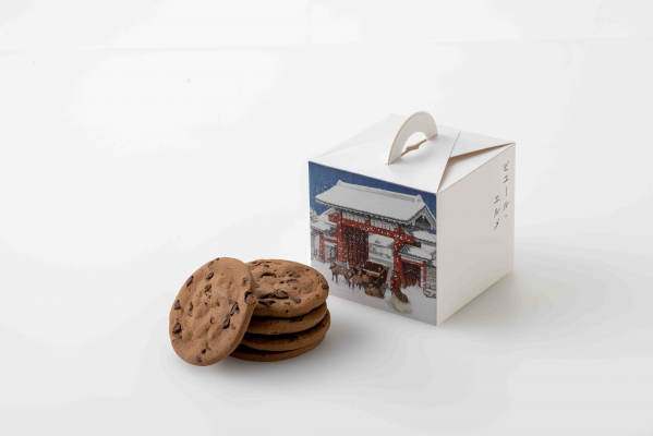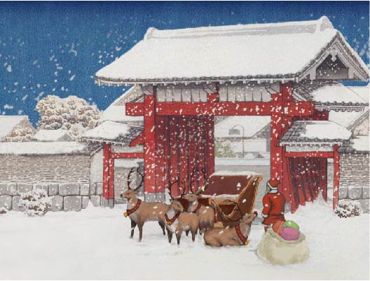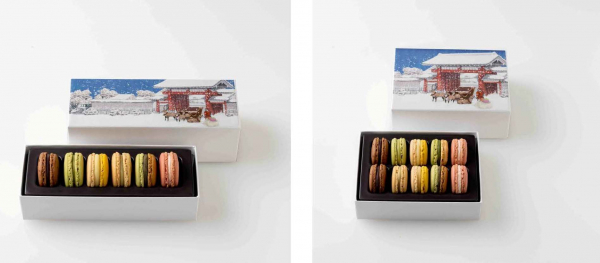 大正・昭和期に活躍した浮世絵師、川瀬巴水による「芝大門之雪」(昭和11年)をアレンジ。マカロンを袋に詰めたサンタクロースとソリをひくトナカイの遊び心あふれる限定パッケージです。