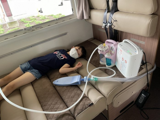 在宅ケアで実際に使う医療機器をキャンピングカーに標準装備されているサブバッテリーにつなぎ、車内に定点カメラを設置し、動作確認を行い、稼働可能時間を算出しました。
