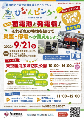 在宅にて医療的ケアが必要な子ども「医ケア児」の災害時避難手段・一時避難所としてキャンピングカーを活用するアシストネットワーク事業「ひなんピング」を運営する特定非営利活動法人輝くママ支援ネットワーク「ぱらママ」(岡山県岡山市、代表理事:藤井弥生)は、コロナ禍においてひっ迫する医療業界や、ワクチン接種に取り組む自治体、サービス運営が困難な企業の支援を目的とした車両の開発を目指す共同事業体(コンソーシアム)「メモラボ」を運営するキャンピングカー株式会社(本社:東京都渋谷区、代表取締役社長:頼定 誠)との協働により、2022年9月21日に開催するハイブリッド展示会・見学会において、医療関係者、機器メーカーなど各専門家の見解や、電源の確保を必要とするユーザーの意見を交えながら、万が一起こり得る災害に備えた電源確保の重要性を説明いたします。