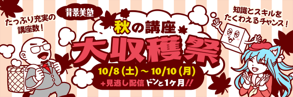 アシスタント背景美塾MAEDAX派は、漫画・イラスト制作向け短期集中型オンラインイベント講座『秋の講座大収穫祭』を10月8日(土)〜10月10日(月)の3日間に開催いたします。