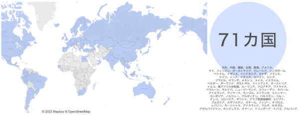 コロナ前は日本を含め38の国や地域の訪日外国人分析が行えており、訪日外国人の増加と共に弊社の訪日外国人分析も日本全国でご好評をいただいていました。しかしながら2020年から始まった世界的なパンデミックの影響により訪日外国人は文字通り”蒸発”してしまいました。相当悩み抜いたコロナ禍ではありましたが、分析範囲と精度を高める機会と捉えてパンデミックの収束と訪日外国人の復活を期待しながら調査・研究・開発、また実証実験を進めました。その結果この度33の国や地域が追加され、なんと71の国や地域の分析が可能になり、これは訪日外国人全体の実に98%以上をカバーしています(2019年「日本政府観光局(JNTO)」の「訪日外客数(総数)」より)。