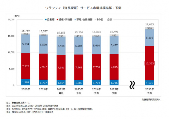 通信・IT機器カテゴリの成長を要因として、2025年の国内ワランティ(延長保証)サービス市場規模は1兆5,491億円、2030年には1兆7,693億円まで拡大を予測する。